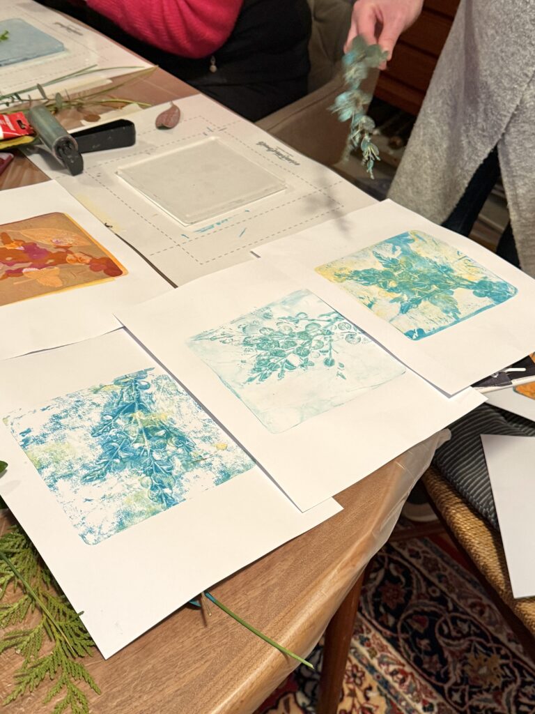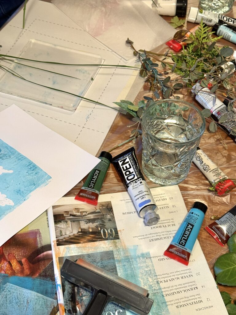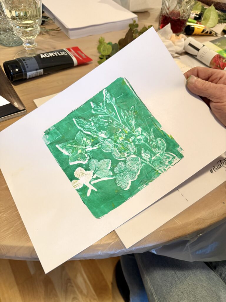 Beim letzten Kreativ Circle ist ein kleiner Garten entstanden – nicht draußen, sondern direkt auf Papier. Gedruckt mit der Gelli Platte, mit Blättern, Gräsern und allem, was wir so zwischen den Fingern hatten.