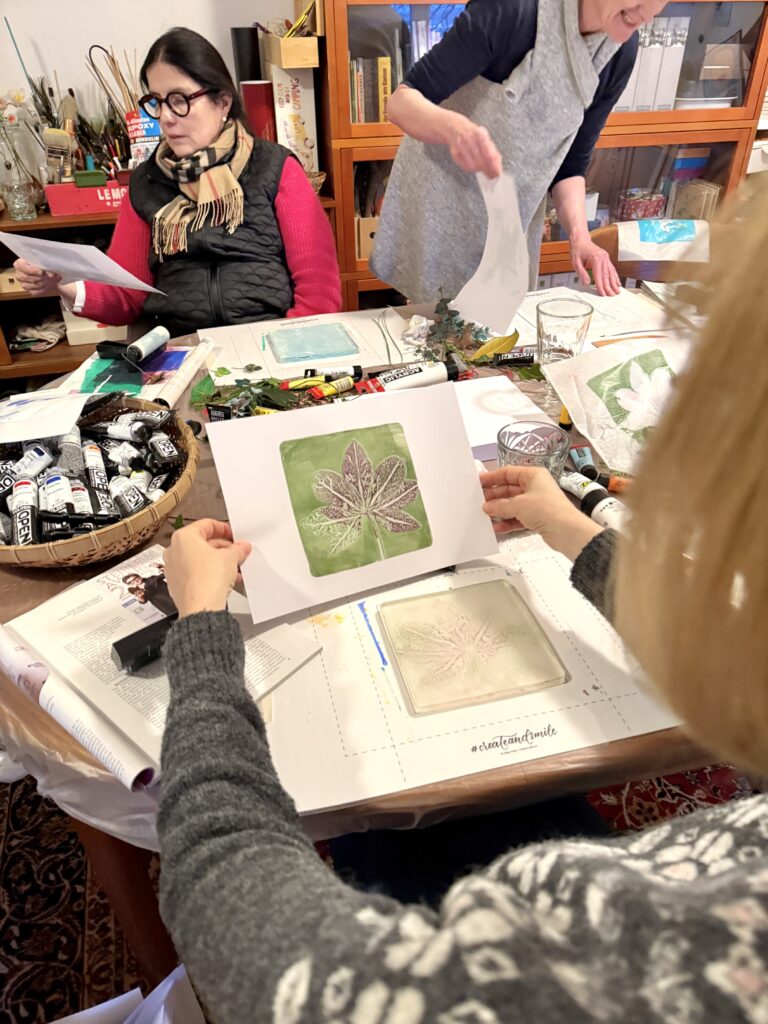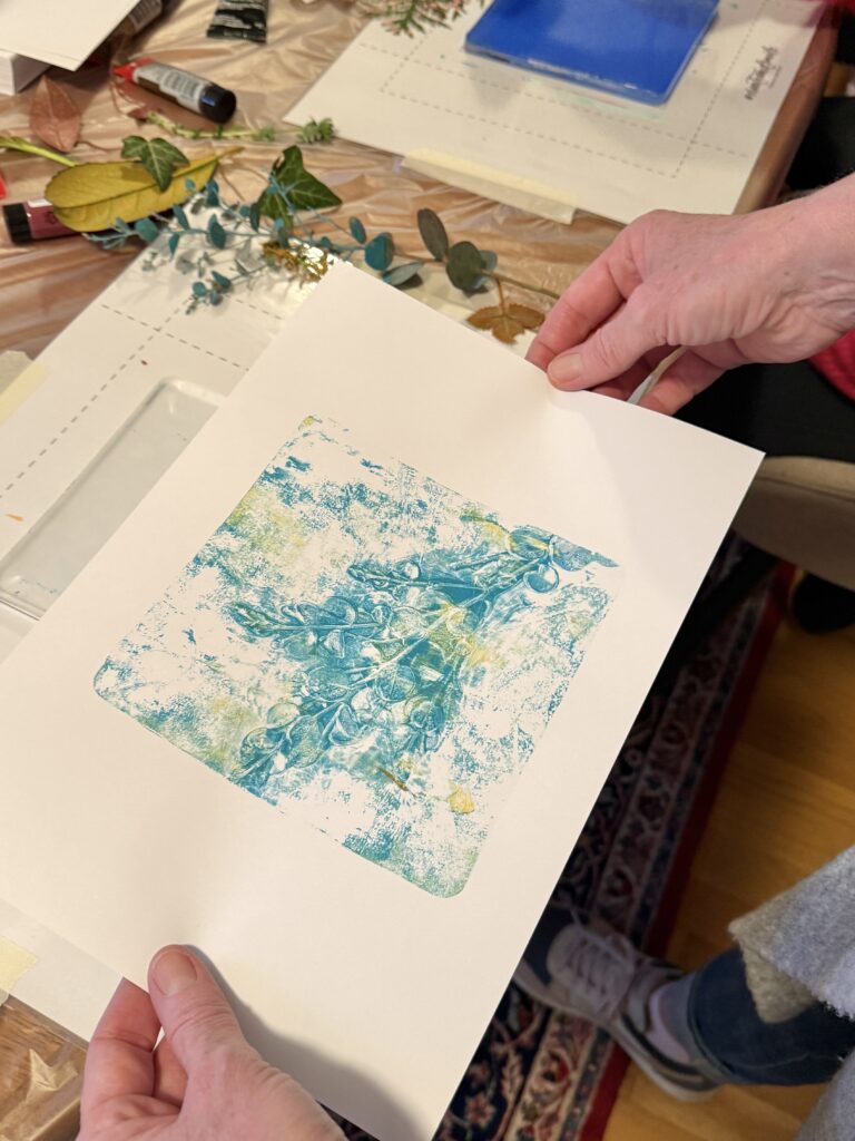 Am Anfang noch vorsichtig, dann immer mutiger. Farbe auftragen, Blätter auflegen, drüberrollen, abziehen … und dann dieser Moment, wenn das Papier hochgehoben wird.