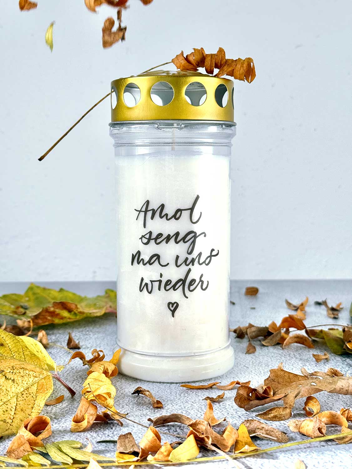 Gestalte deine Grabkerze ganz persönlich mit liebevoll handgeletterten Sprüchen. 🌟