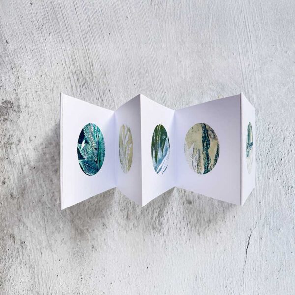 Wir drucken spielerisch und achtsam mit der Gelplatte und Naturmaterialien. Du lernst, wie Gelli Print funktioniert und wie du mit zwei Farben unterschiedliche Strukturen und Tiefen entstehen lassen kannst. Aus deinen Drucken wählst du deine liebsten Ausschnitte aus und gestaltest daraus ein Leporello – wie ein gedruckter Garten, Seite für Seite.